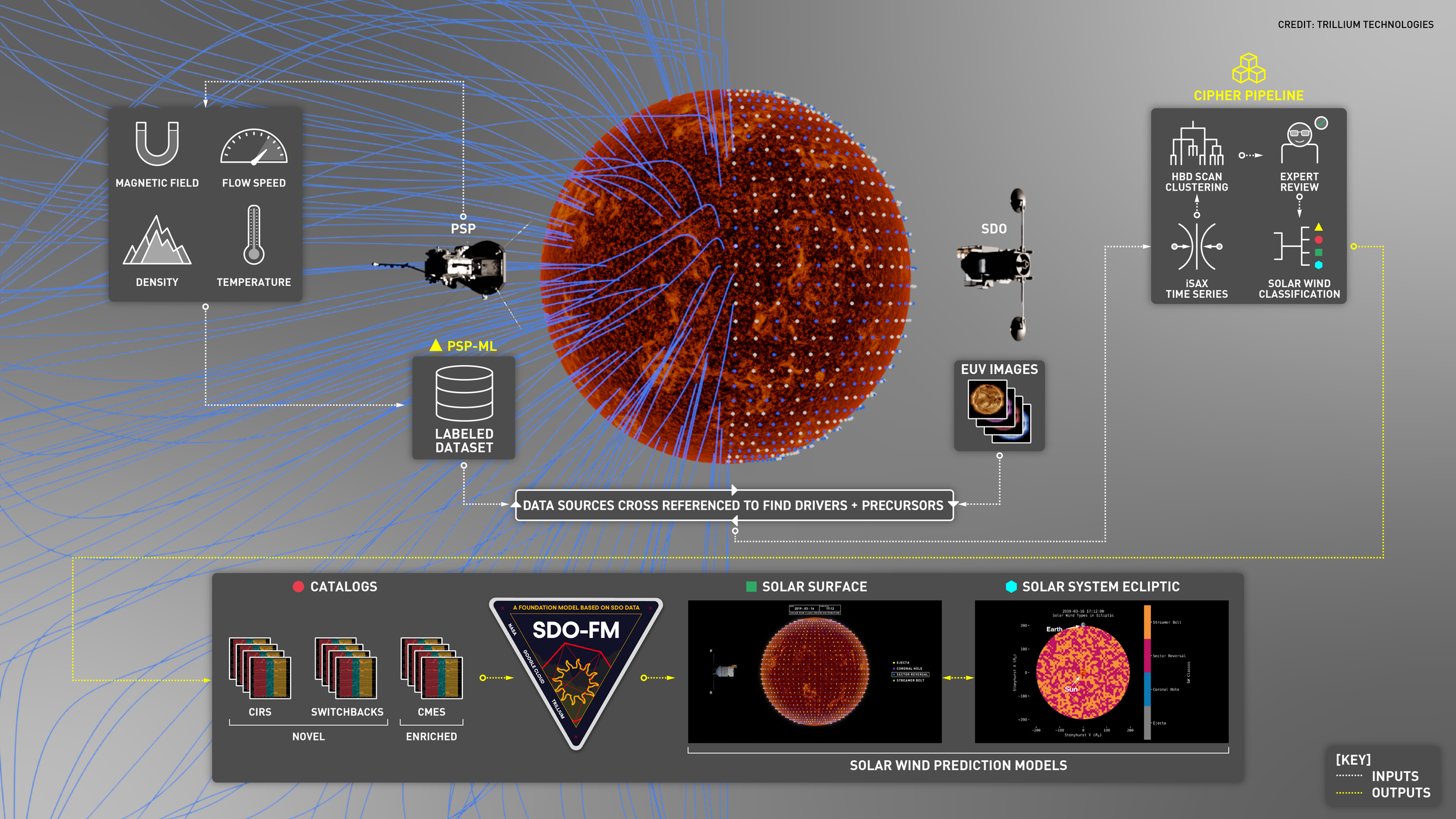 Meanwhile, the same architectures that power language systems like Gemini, Claude, and ChatGPT are now reshaping solar science. These foundation models, trained not on text but on terabytes of solar imagery and magnetograms are learning to interpret the Sun as a dynamic system. For the first time, the Decoding the Solar Wind team has used a solar foundation model (SDOFM) as the basis of a research product laying the groundwork for follow-up studies with NASA’s new SOTA Surya SDO Foundation model.